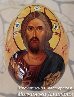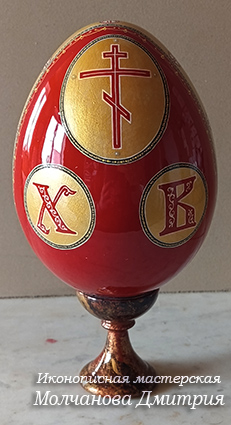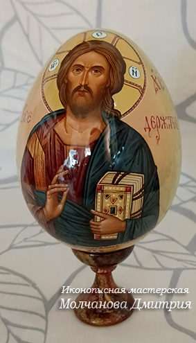 Пасхальное яйцо-сувенир с образом Иисуса Христа написано в каноничном стиле православной живописи. Роспись такого Пасхального сувенира трудоемкий процесс. Деревянная заготовка покрывается специальным меловым грунтом - левкасом. Левкас наносится множеством тонких слоев, которые после высыхания отшлифовываются до очень гладкого состояния. Теперь заготовка готова к живописи. После написания Образа Пасхальное яйцо лакируется 4-6 слоями лака. Каждый слой лака шлифуется. В результате яйцо приобретает глянцевое, словно зеркальное покрытие. Немного опишем Пасхальное яйцо, представленное на этой странице. На этом Пасхальном сувенире изображен образ Иисуса Христа называемый Господом Вседержителем. Христос держит руку в благословляющем жесте, а другой руке у него находится Евангелие. Это каноничное иконное изображение Господа Иисуса очень распространено в православной живописи. Такой Образ Иисуса Христа - Спасителя встречается на иконах и в росписи храма, и ,конечно, на Пасхальных яйцах-сувенирах. Высота Пасхального яйца без подставки 12 см, с подставкой - 17 см. Композиционный центр - это полуфигура Иисуса Христа, которая отличается богатым цветовым сочетанием, а все Пасхальное яйцо благородным колоритом. Фон вокруг Спасителя написан «врастяжку» - от нежно-розового цвета до практически мятного. На нимбе и орнаментальной полосе расположен изящный, четкий рукописный орнамент. С обратной стороны располагается изображение Православного креста и буквы Х В (Христос Воскресе!). Обратная сторона Пасхального сувенира насыщенного красного цвета. Что создает визуальную гармонию с золотыми деталями. Подставка выделяется богатым сочетанием золотого и красного цветов, выполена в технике «мраморение». Пасхальное яйцо можно заказать на нашем сайте. Этот Пасхальный сувенир с Образом Господа Вседержителя будет прекрасным подарком не только в Пасху, но и на любое другое значимое торжество.
